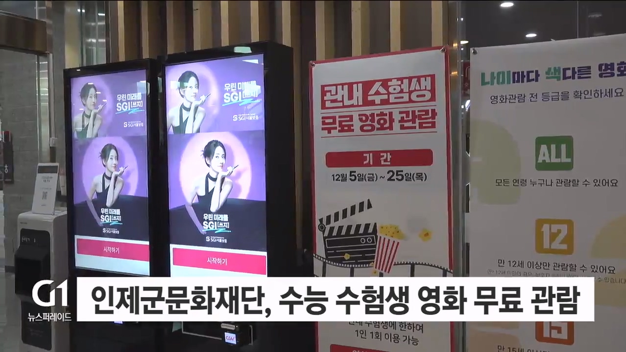 오는 25일까지 수험표와 신분증을 지참한 수험생은 관내 CGV 인제점·원통점·기린점에서 무료로 영화를 볼 수 있습니다.