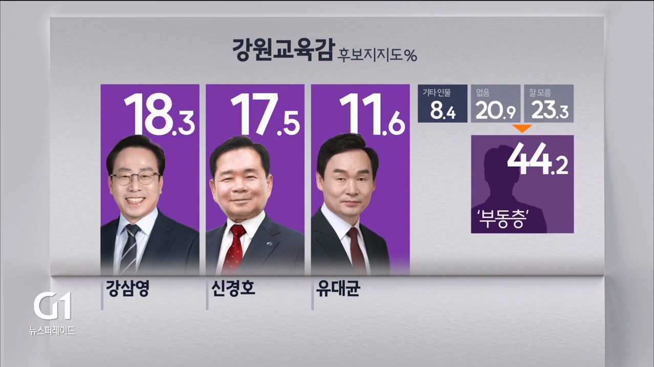이어 신경호 현 교육감 17.5%, 유대균 전 교육부 장학관 11.6%, 기타 인물 8.4% 였습니다.