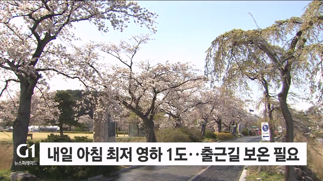 아침 최저기온은 영하 1도에서 영상 6도, 낮 최고기온은 영서권 영상 15도에서 17도, 영동권 영상 16도에서 17도 사이의 분포를 보이겠습니다.