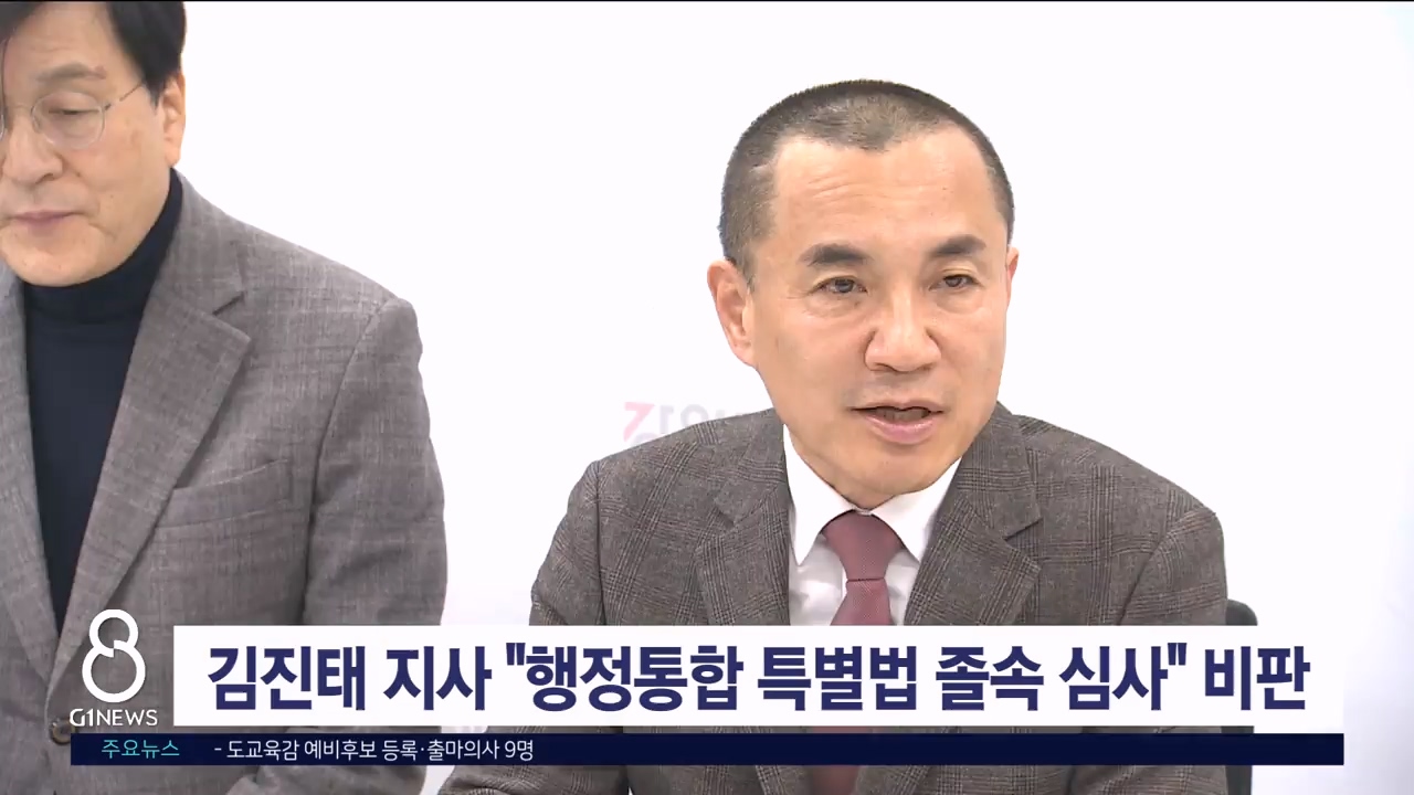 김 지사는 오늘(23일) 도청에서 가진 기자 간담회에서 "행정 통합 특별법의 조문이 천190개에 달하는데 사흘 만에 심사했다는 건 졸속 심사를 자백하는 것과 같다"고 꼬집었습니다.