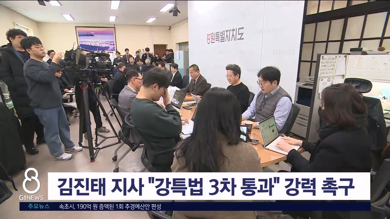 김진태 강원자치도지사가 전남광주 통합 특별법 통과를 계기로 강원특별법 3차 개정안 통과를 재차 촉구했습니다.