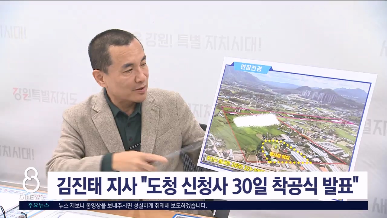 김진태 지사는 오늘(9일) 도청 기자 간담회에서 "오는 30일 도청 신청사 착공식을 진행한다"며 "현 도청사 활용 방안은 이달 중 별도로 발표하겠다"고 밝혔습니다.