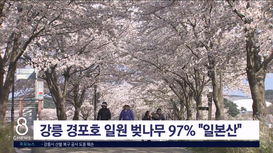 강릉 경포호 일원 벚나무의 97%가 일본 소메이요시노벚나무와 처진올벚나무인 것으로 조사됐습니다.