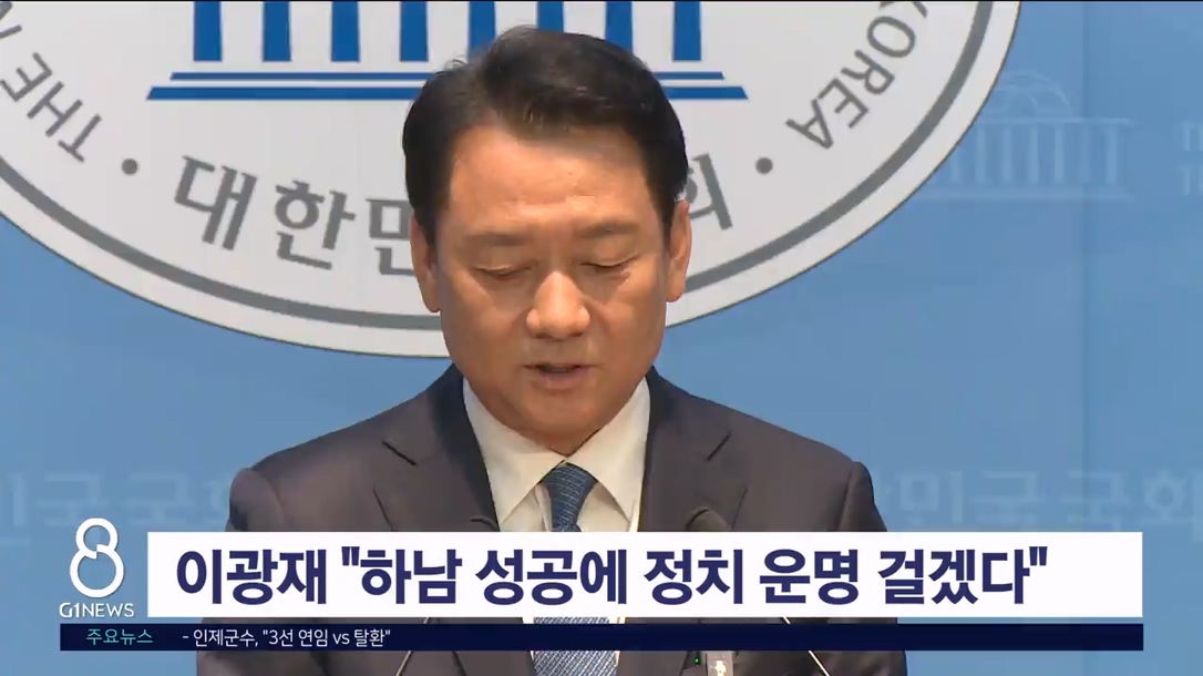 이광재 전 지사는 오늘(30일) 국회 소통관에서 기자회견을 열고 "하남의 성공에 정치적 운명을 걸겠다"면서 지역구의 성적표가 정치인의 성적표가 되는 정치 혁명의 길에 동참해 달라고 호소했습니다.