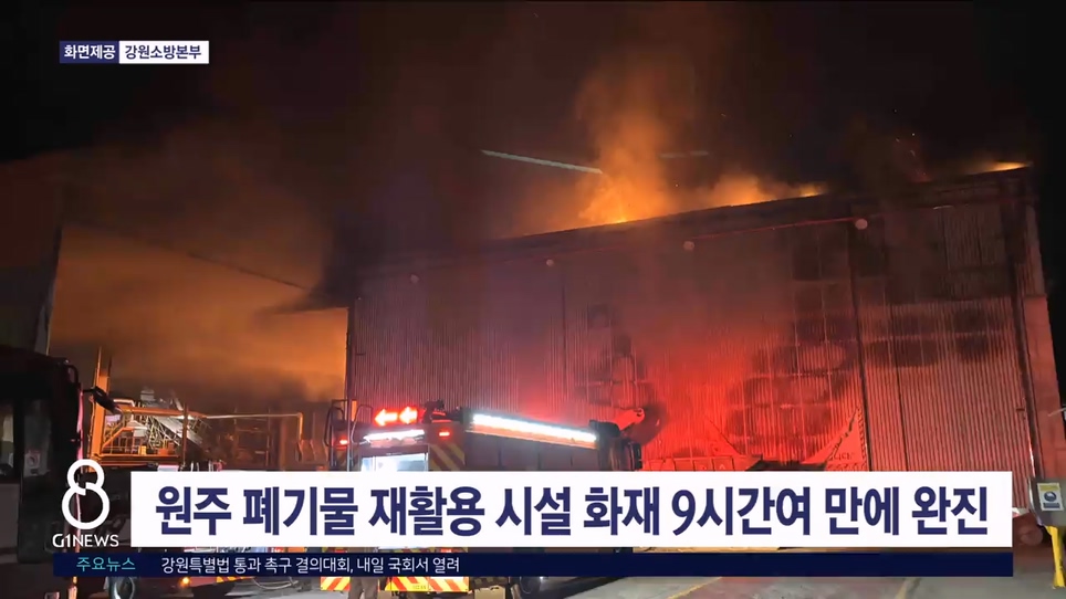 오늘(8일) 오전 6시쯤 원주시 지정면의 한 폐기물재활용 시설에서 불이나 약 9시간 만에 꺼졌습니다.