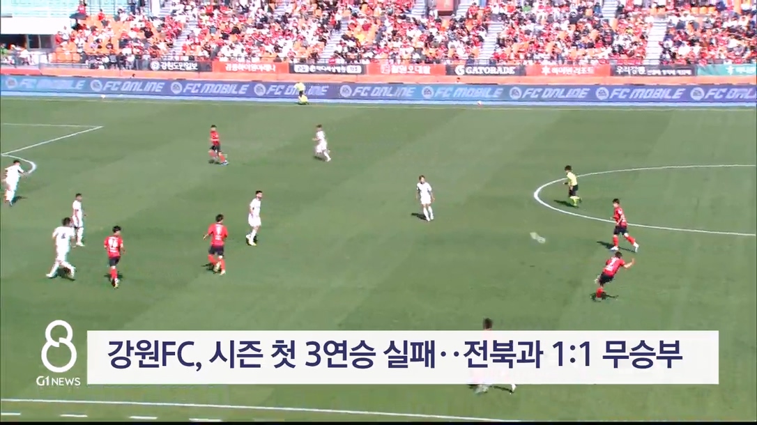 강원은 오늘(18일) 강릉 하이원아레나에서 열린 전북현대와의 K리그1 8라운드 경기에서 1대1 무승부를 기록했습니다.