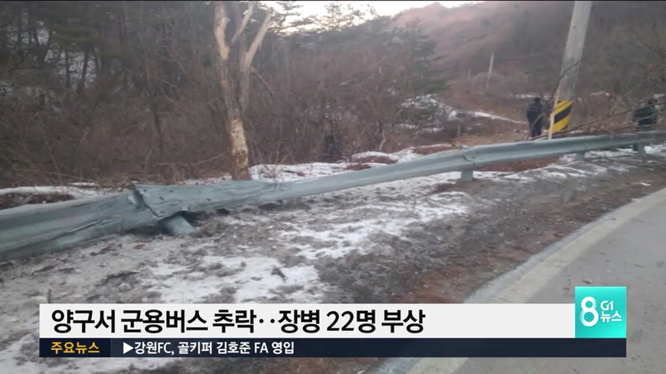 오늘 오후 5시 3분쯤 양구군 방산면 고방산리, 일명 '도고터널' 인근에서 군용버스가 도로 옆 20여 미터 아래로 추락했습니다.