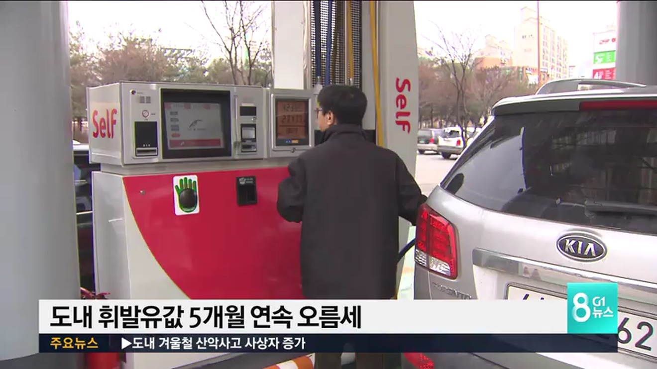 도내 휘발유 값이 5개월째 오름세를 보이고 있는 것으로 나타났습니다.