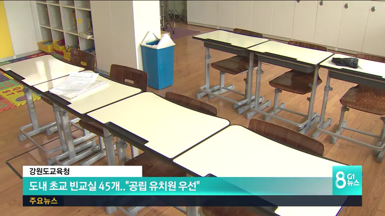 지난해 4월 기준 도내 초등학교의 어린이집 유휴교실은 춘천과 원주, 동해 등 8개 지역 12개 학교 45개실인 것으로 집계됐습니다.