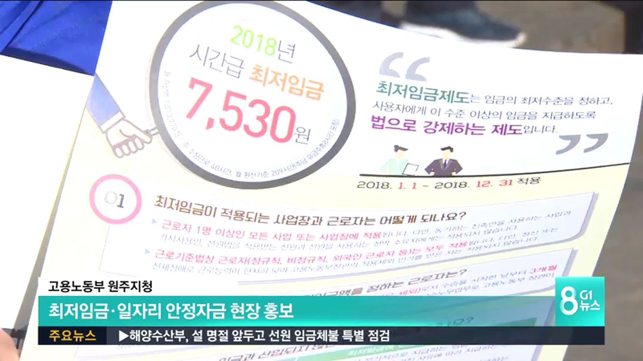 원주고용노동청은 오늘 원주시외버스터미널 일대에서 최저임금 준수 필요성을 설명하고, 영세사업자의 인건비 부담을 덜어주는 일자리 안정자금을 홍보하는 캠페인을 벌였습니다.