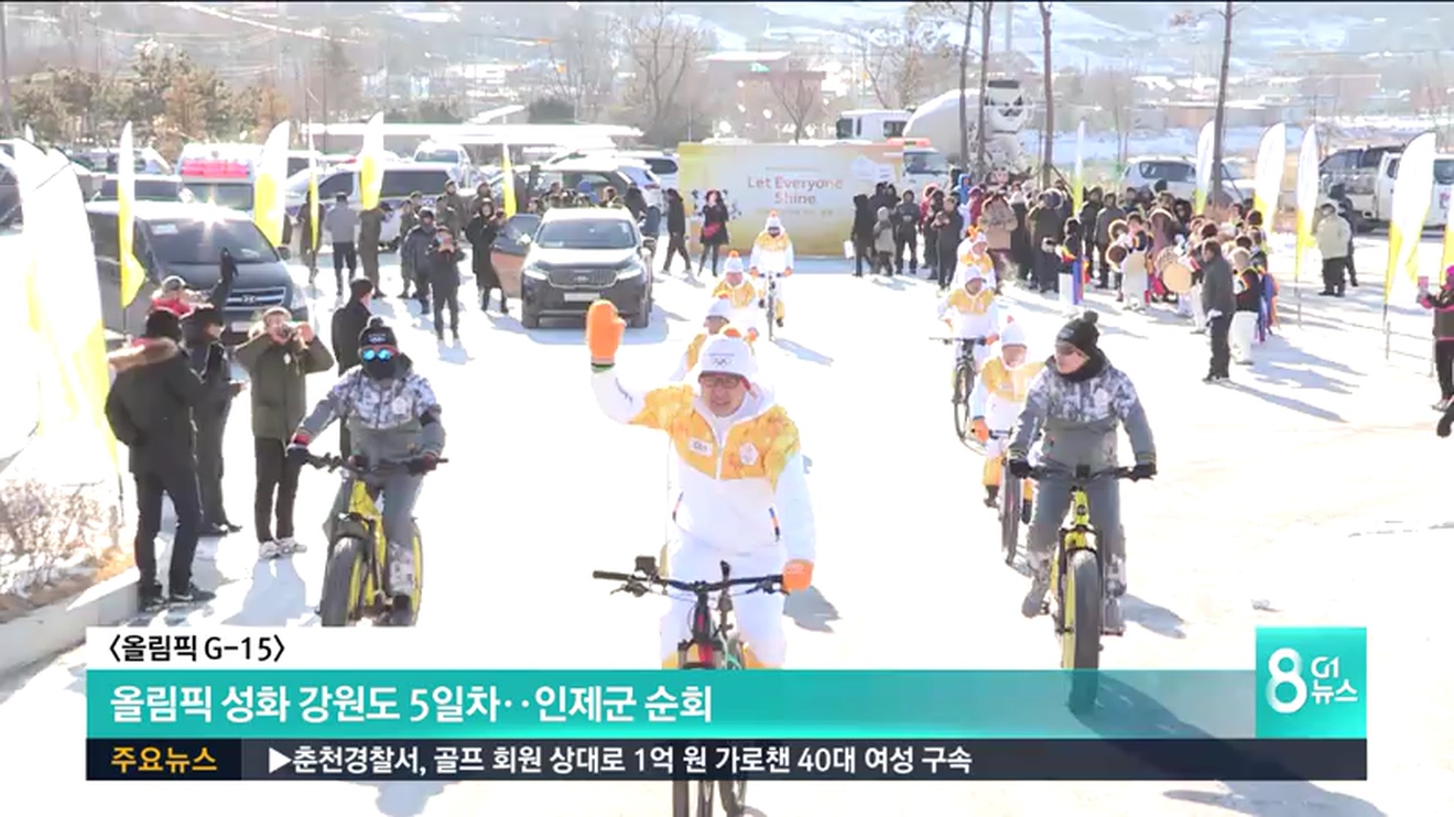 강원도 성화봉송 5일차인 오늘, 성화는 서화생활체육공원을 출발해 인제육교와 산촌 민속박물관 등을 거쳐 인제농산물판매장으로 들어섰습니다.