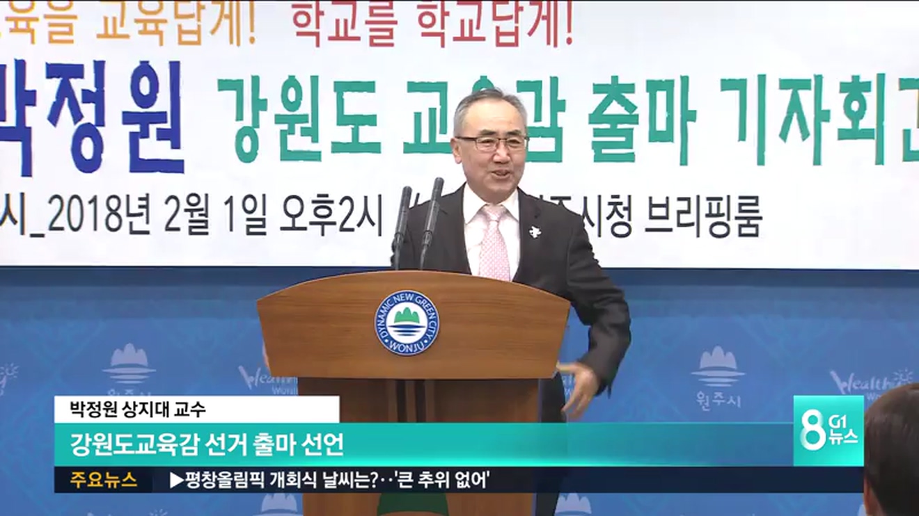 박정원 교수는 오늘 원주시청 브리핑룸에서 기자회견을 열고, "학교를 학교답게, 교육을 교육답게 만들기 위해 출마를 결심했다"며, 기초학문과 기초체력 신장을 통해 강원 교육의 자존심을 회복하겠다고 밝혔습니다.