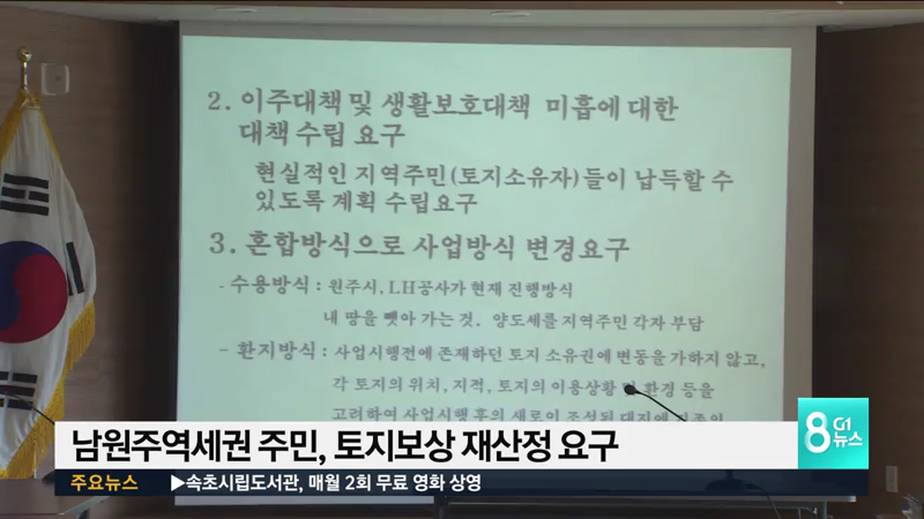 남원주역세권 마을 주민 50여명은 오늘 개발 공동시행사인 원주시와 한국토지주택공사 LH 관계자들이 참석한 가운데 간담회를 열고, LH가 책정한 토지보상이 터무니 없이 낮게 책정됐다며 보상가 재산정 등 3가지 사항을 요구하고, 합의가 이뤄질때까지 사업 중단을 촉구했습니다.