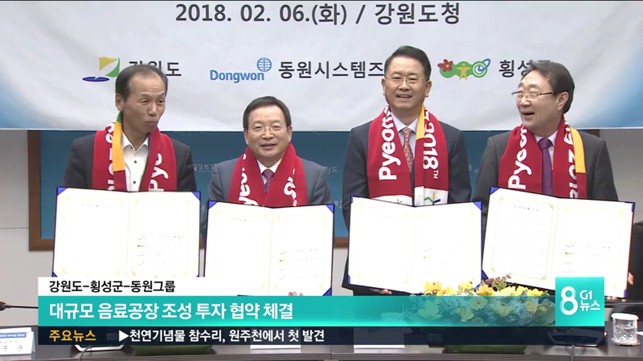 강원도와 횡성군, 동원그룹과 동원시스템즈는 오늘(6일) 도청 본관 소회의실에서 횡성에 대규모 공장을 짓기 위한 투자 협약을 체결했습니다.