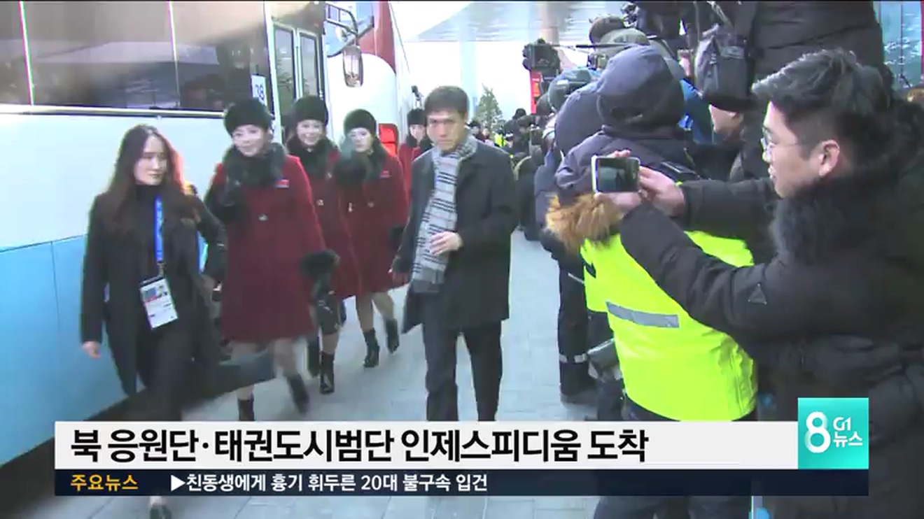 280여명 규모의 북한 응원단과 태권도 시범단 등이 오늘 숙소인 인제 스피디움에 도착했습니다.