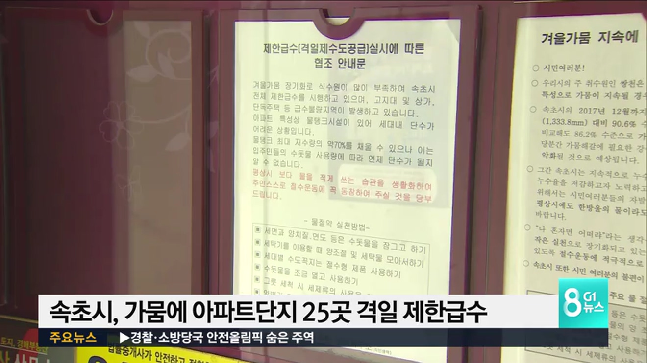 극심한 겨울 가뭄을 겪고 있는 속초시가 오늘(20일)부터 공동주택을 대상으로 격일제 급수에 들어갔습니다.
