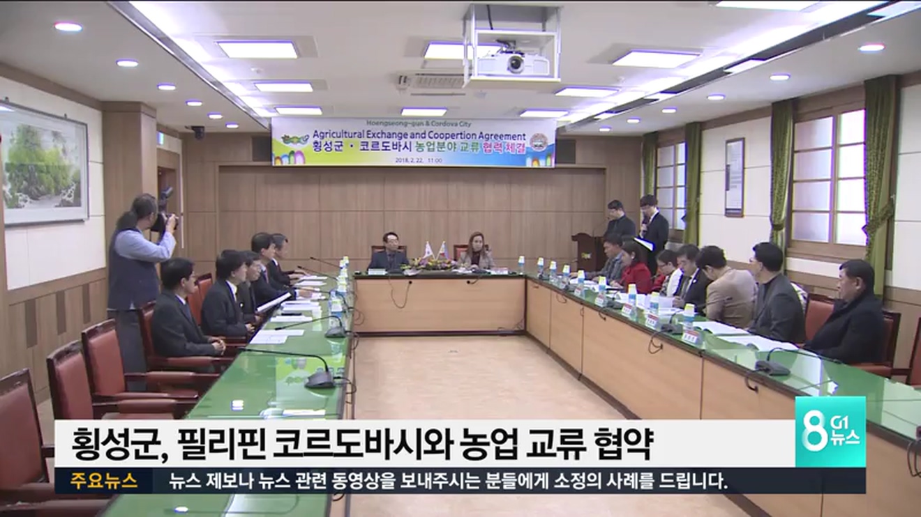 횡성군은 오늘 군청 회의실에서 필리핀 세부주 코르도바시와 농업분야 교류 협약을 체결하고, 농업 경쟁력 향상과 농가 소득증대를 위해 협력해 나가기로 했습니다.