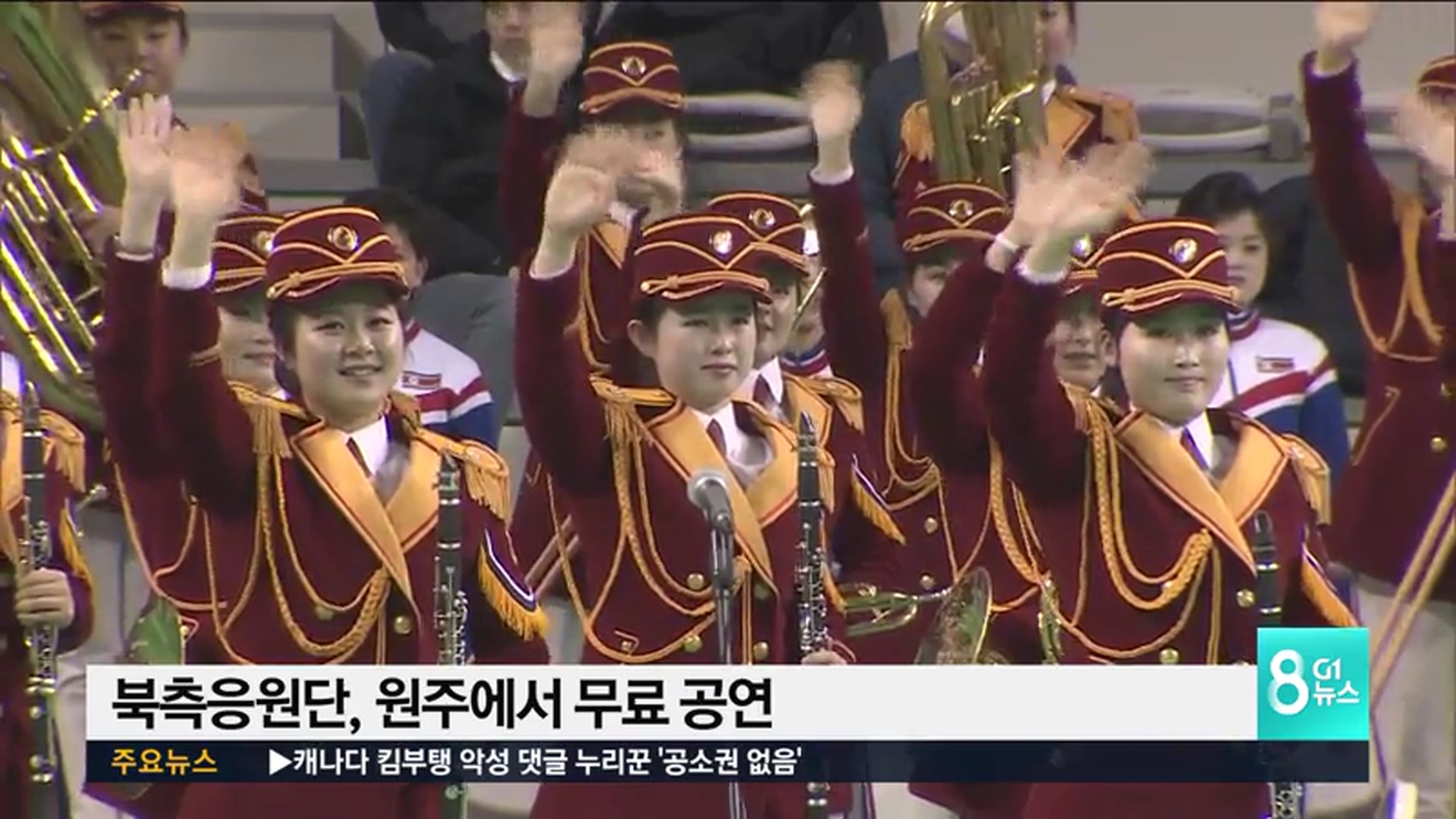 평창동계올림픽 응원을 위해 온 북측 응원단이 오늘 원주종합체육관에서 원주시민 3천 500여명이 참석한 가운데 무료 공연을 펼쳤습니다.