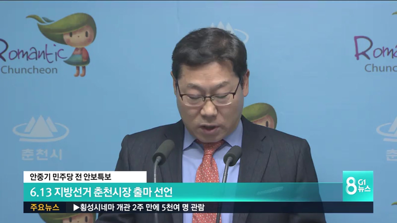 안중기 더불어민주당 전 안보특보는 오늘 춘천시청에서 기자회견을 열고, "옛 캠프페이지에 '세계전통 문화예술 체험 테마파크'를 조성하겠다"며 춘천시장 출마의 변을 밝혔습니다.