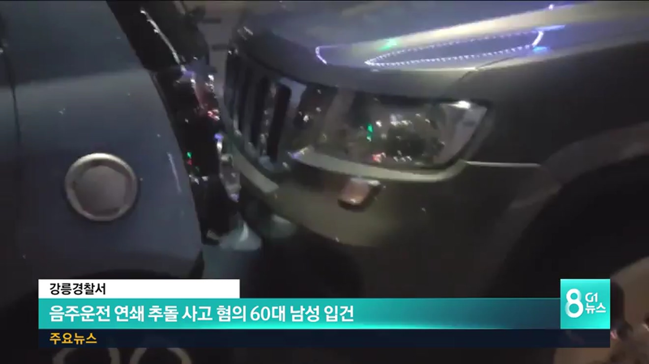경찰에 따르면 주씨는 오늘 새벽 4시쯤 강릉시 성덕포남로 교차로 인근 도로에서 술을 마신채로 자신의 싼타페 승용차를 운전하다, 도로변에 세워져 있던 포터를 들이받는 등 주차된 4대의 차량을 추돌하는 사고를 낸 혐의를 받고 있습니다.