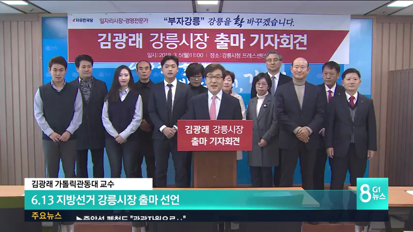 자유한국당 소속 김광래 가톨릭관동대 교수는 오늘, 강릉시청 브리핑룸에서 기자회견을 열고, "올림픽 도시 강릉을 '부자 강릉'과 '글로벌 도시'로 만들겠다"며 강릉시장 출마를 선언했습니다.