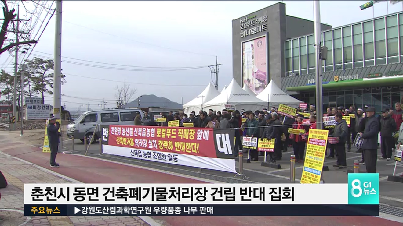 춘천시 동면 장학2리와 신북읍 주민들로 구성된 건축 폐기물 처리장 반대 대책위원회는 오늘 신북읍 로컬푸드 매장 주차장에서 집회를 갖고, 건축 폐기물 처리장 조성이 북한강과 불과 100여m 떨어진 곳에 추진되고 있어 환경 오염 우려가 크다고 주장했습니다.