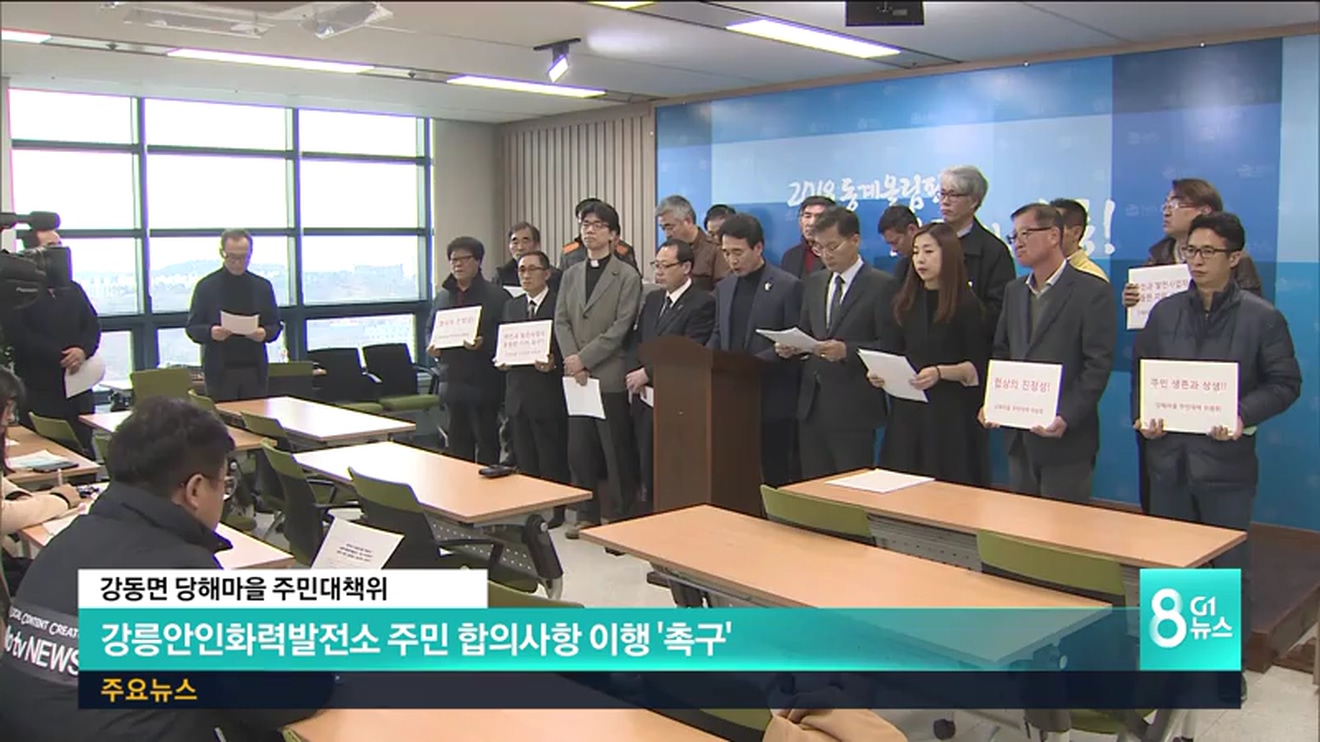 강릉시 강동면 주민들이 오늘 강릉시청 브리핑룸에서 기자회견을 열고, "강릉안인화력발전소 건설을 위해 지역 주민과 합의한 사항을 이행하라"고 촉구했습니다.