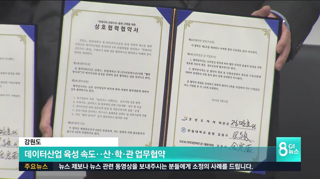 강원도는 오늘 정보통신 기술 전문 기업인 더존비즈온과 한림대가 참여하는 '빅데이터 산업수도 춘천' 구현을 위한 업무협약을 체결했습니다.