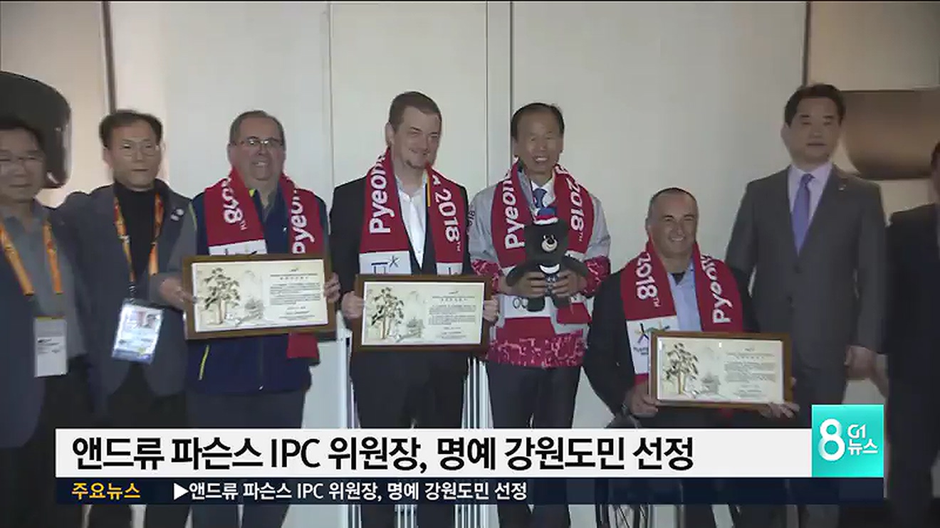 최문순 도지사는 오늘 오후 강릉 씨마크호텔에서 앤드류 파슨스 IPC 위원장에게 평창 동계 패럴림픽의 성공 개최에 기여한 공로를 인정해, 명예 강원도민 증서를 수여했습니다.