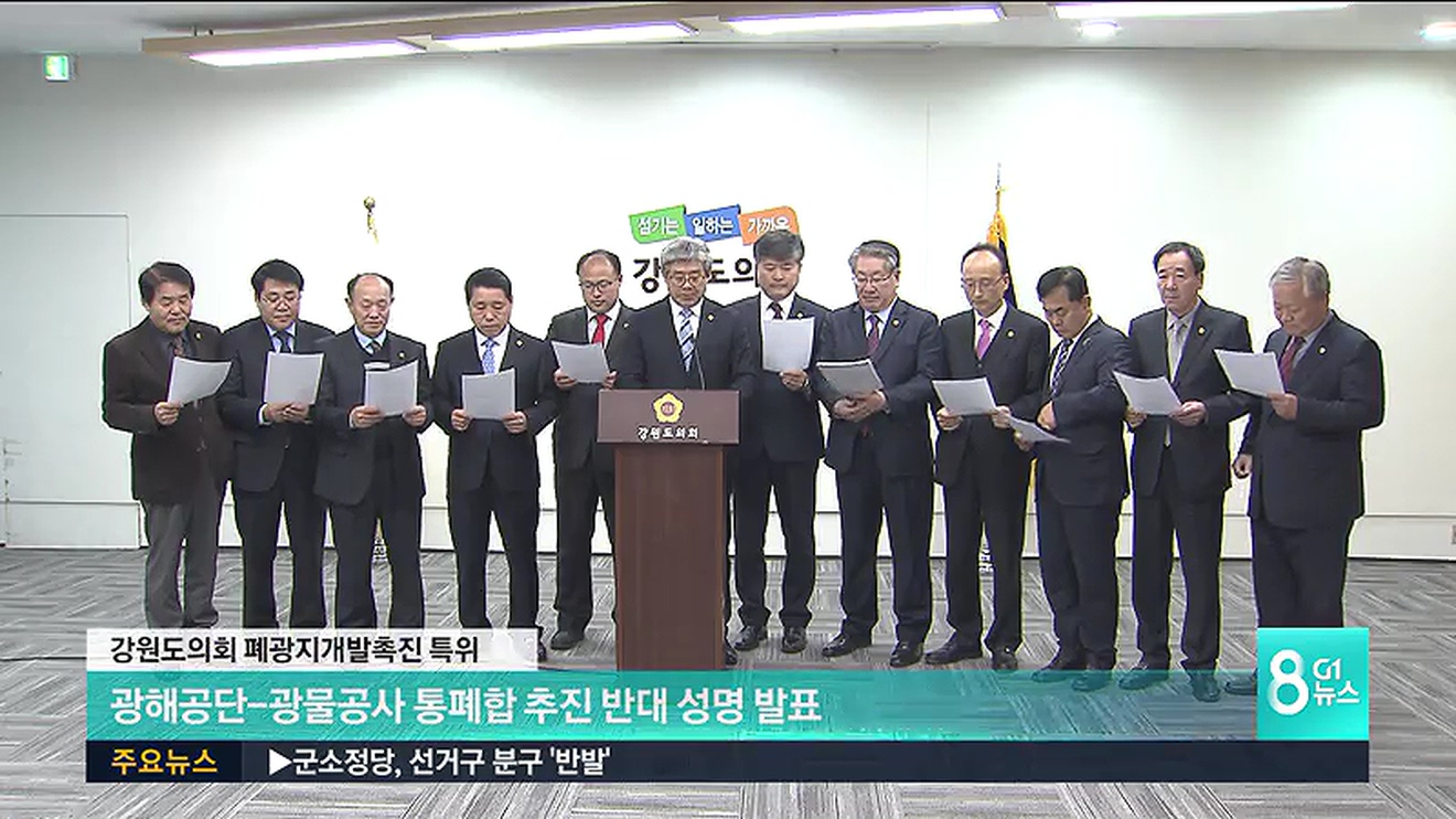 강원도의회 폐광지역개발촉진지원 특별위원회가 광해관리공단과 광물자원공사 통폐합 추진 중단을 촉구하는 성명서를 발표했습니다.