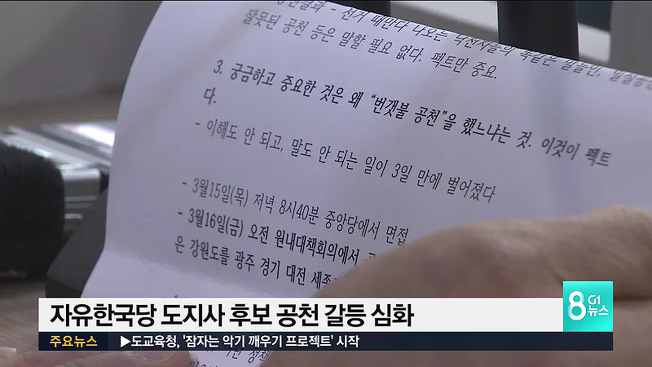 이에 대해 공천 경쟁에 나섰던 김연식 전 태백시장은 "당 사무총장이 강원을 계속 심사지역으로 분류한 지 3일 만에 전략 공천한 명확한 이유를 밝혀 달라"며 "후보에게 비전을 밝힐 기회는 줘야하는 것 아니냐"며 반발했습니다.