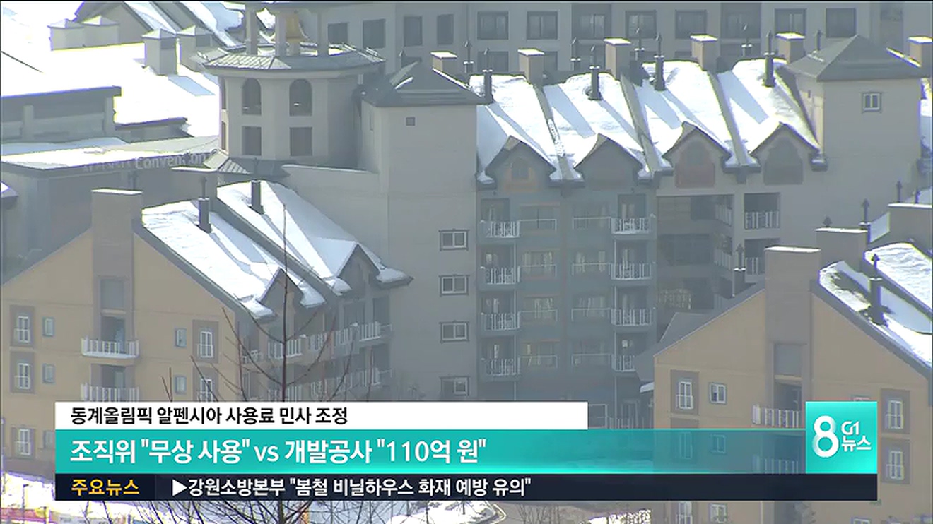 동계올림픽 개최 전부터 알펜시아 시설물 무상 사용을 두고 논란을 빚었던 조직위와 강원도 개발공사가 법정에서 만났지만, 절충안을 찾지 못했습니다.