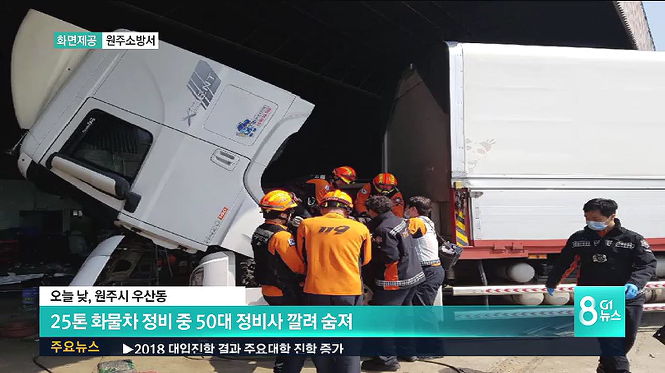 오늘 낮 12시쯤 원주시 우산동의 한 자동차 정비업체에서 25톤 화물차를 정비하던 50살 안모씨가 차량 운전석에 깔려 숨졌습니다.