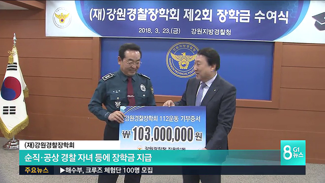 재단법인 강원경찰장학회는 오늘 강원지방경찰청에서 장학증서 수여식을 개최하고, 순직·공상 경찰 자녀와 대학 신입생 자녀 271명에게 장학금 1억 5천 50만원을 지급했습니다.