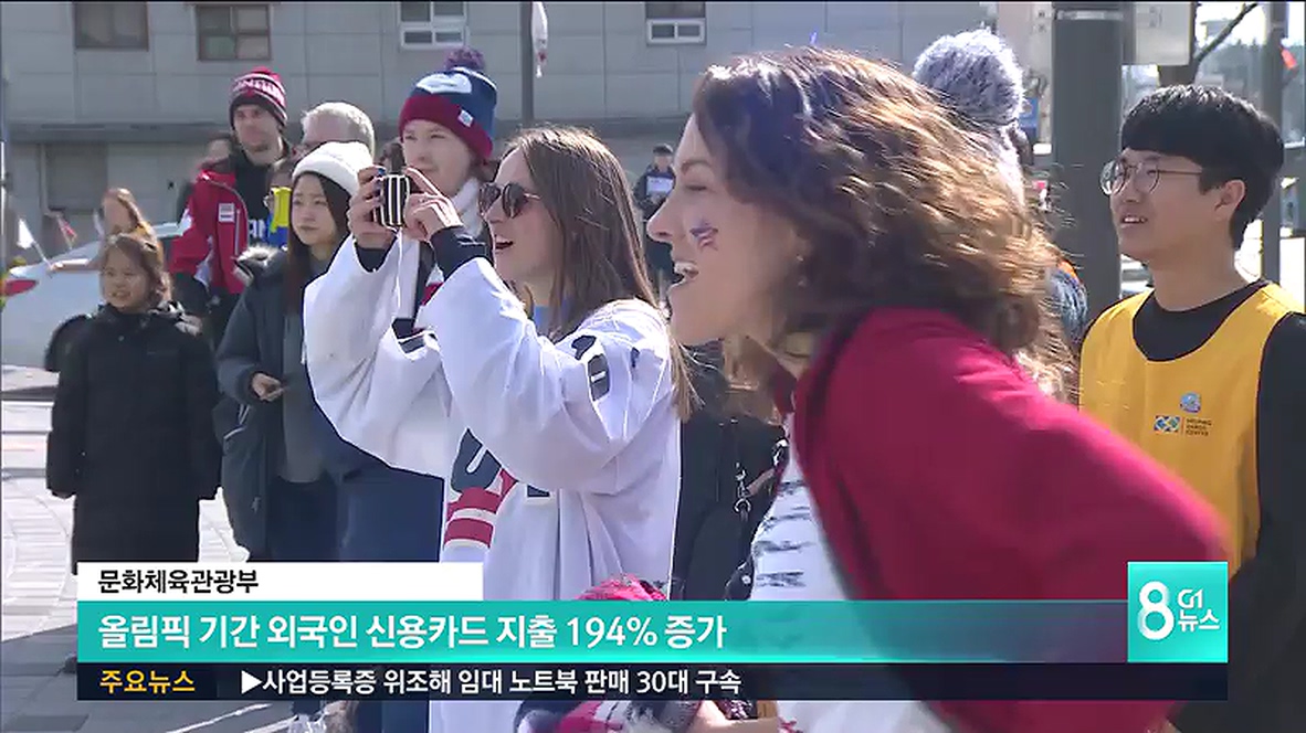 문화체육관광부는 동계올림픽이 열린 지난 2월 9일부터 25일까지 도내에서 외국인이 쓴 신용카드 지출액은 165억 4천만 원으로 지난해 같은 기간 56억 3천만 원보다 194% 증가했다고 밝혔습니다.