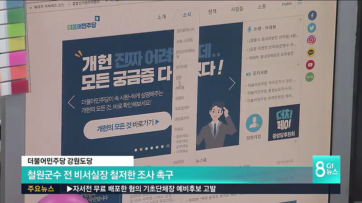 민주당 도당은 "철원군 선관위가 지난해 8월부터 6.13 지방선거 군수 경선에 필요하다면서 주민 820여명으로부터 입당 원서를 받은 혐의로 철원군수 전 비서실장 A씨를 조사중이고, 이는 명백한 공무원 선거중립위반인 만큼 철저한 조사를 촉구한다"고 밝혔습니다.