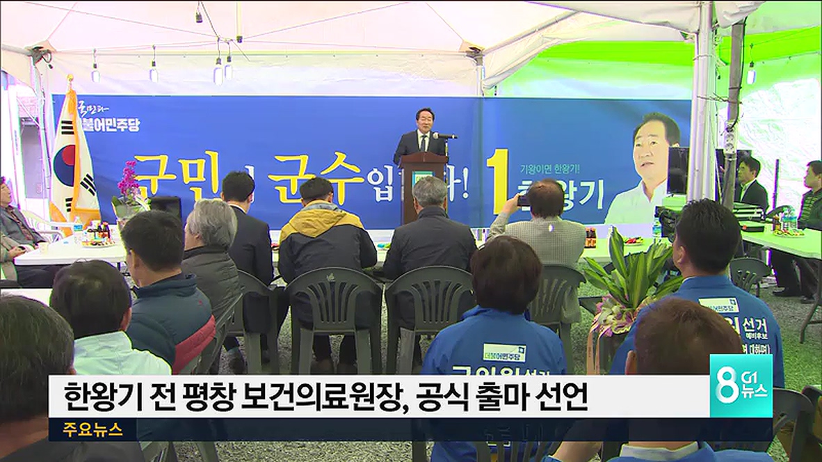 한왕기 전 원장은 오늘(16일), 평창읍 선거사무실에서 출마 기자회견을 열고, "평창 발전과 군민 생활의 질을 높이는데 최선을 다하겠다"며, 농민 기본소득제 도입과 북방경제의 배후기지 준비 등을 공약으로 제시했습니다.