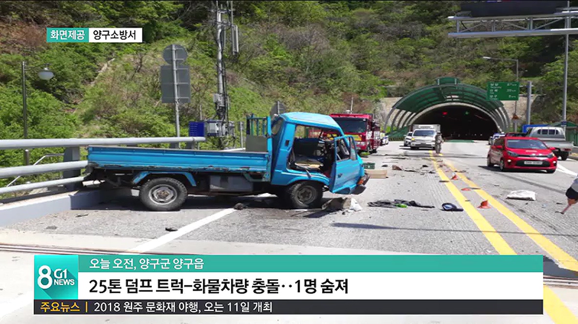 오늘 오전 11시 25분쯤, 양구군 양구읍 웅진2터널 입구에서 25톤 덤프 트럭과 화물 차량이 부딪혔습니다.