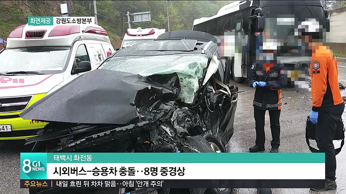 오늘 오후 2시 반쯤, 태백시 화전동 용연동굴 입구 앞 삼거리에서 37살 이모씨가 몰던 카니발 승용차와 승객 11명을 태운 시외버스가 부딪혔습니다.