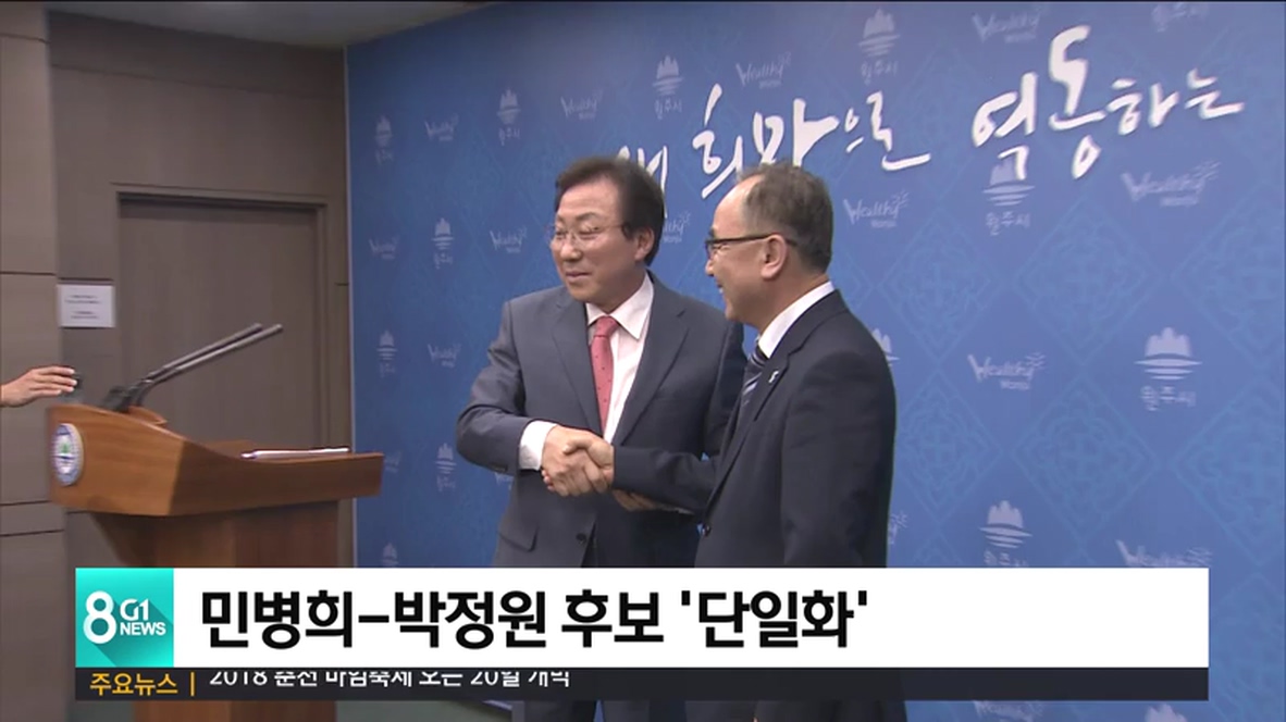 교육감 진보 후보로 분류됐던 민병희. 박정원 후보는 오늘 원주시청에서 공동 기자회견을 열고 민병희 후보를 단일 후보로 결정했다고 발표했습니다.