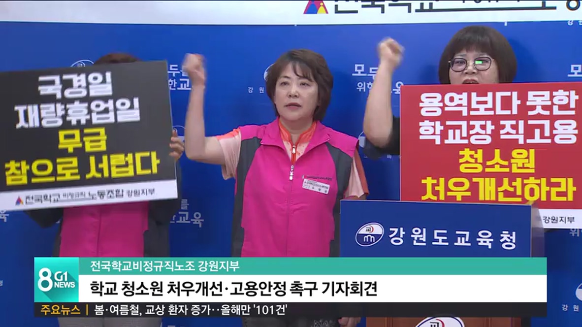 전국학교비정규직노조 강원지부는 오늘(30일) 강원도교육청에서 기자회견을 열고, 학교 청소원의 고용안정과 처우개선을 촉구했습니다.