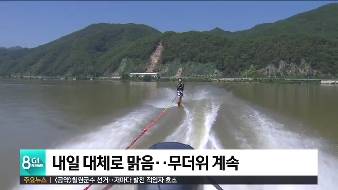 내일 강원도는 대체로 맑은 가운데, 한 낮의 기온이 30도 안팎을 넘나드는 무더위가 이어지겠습니다.