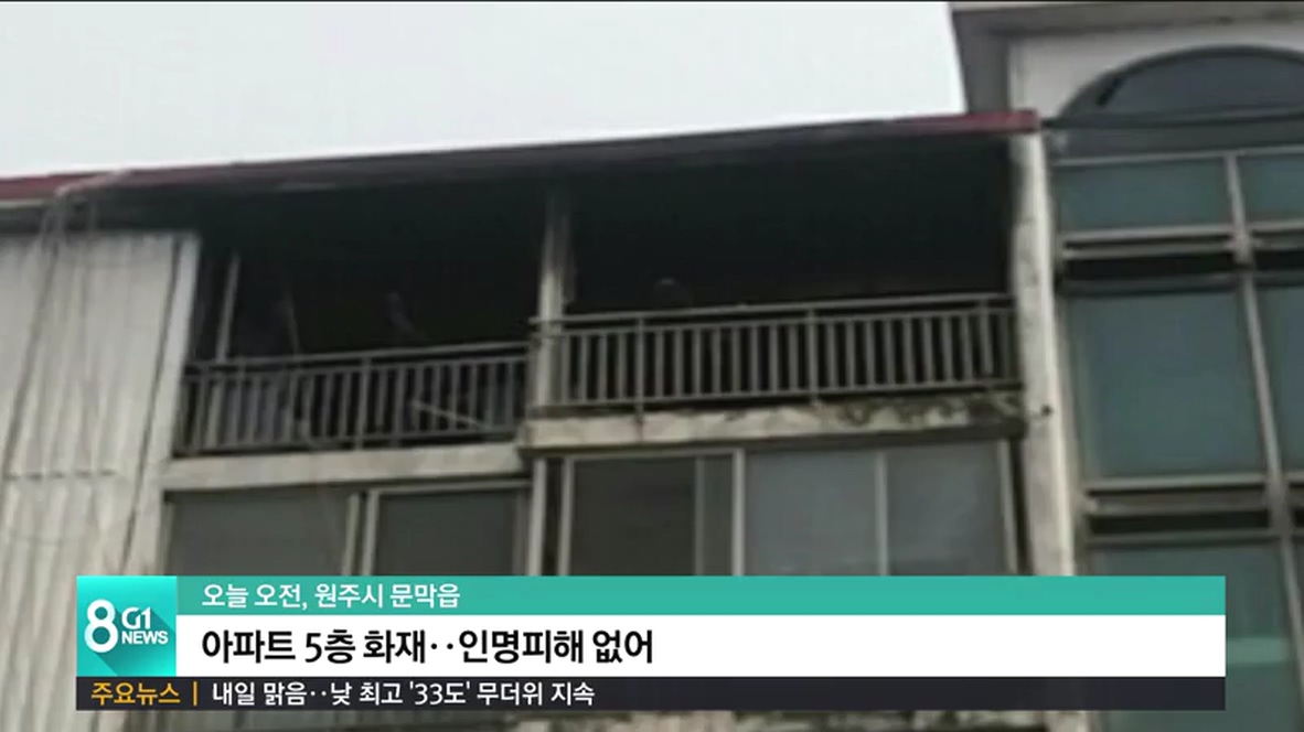 오늘 오전 9시 반쯤 원주시 문막읍의 한 아파트 5층에서 불이 나, 20여분 만에 꺼졌습니다.