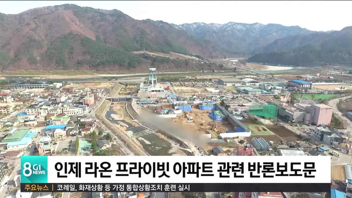 본 방송은 지난 4월 11일 <8시 뉴스> 프로그램에서 인제군의 한 아파트 건설 현장에서 건축계획심의도 없이 사업계획을 승인받아 특혜 의혹이 일고 있으며, 각종 법규를 위반한 채 사업을 강행한다는 취지로 보도한 바 있습니다.