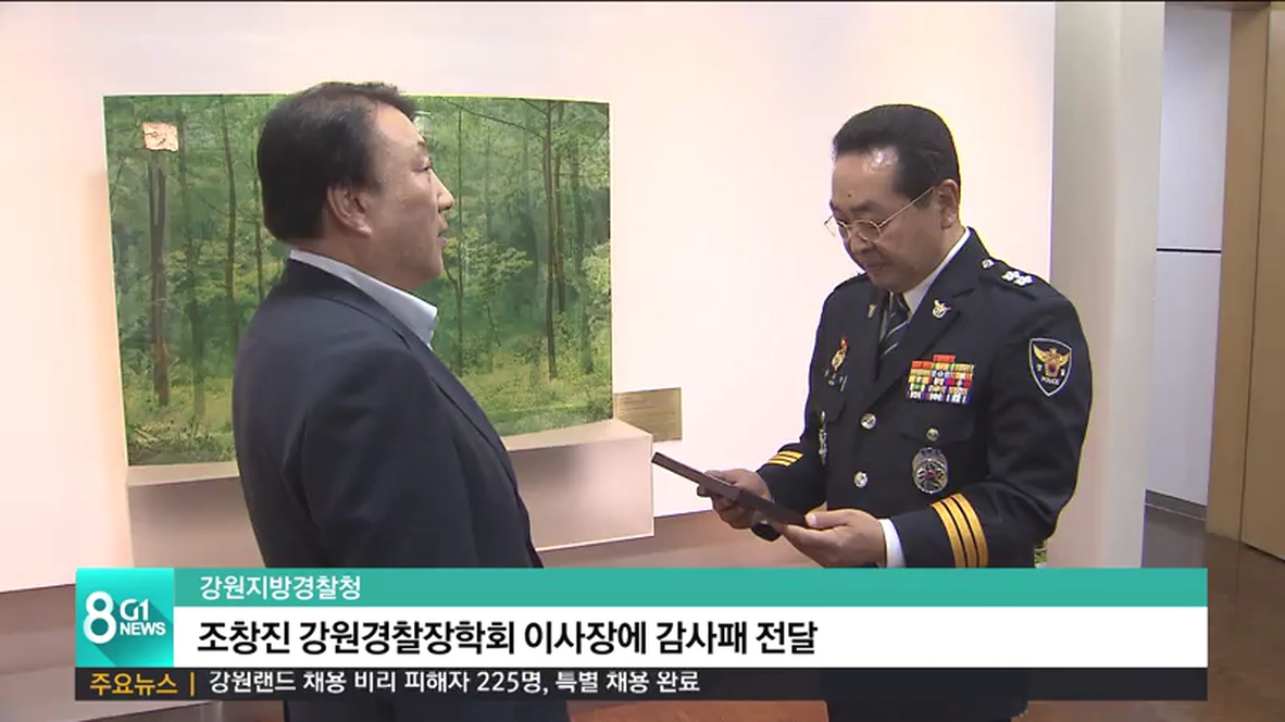 원경환 강원지방경찰청장은 오늘(3일) 강원경찰장학회 이사장을 맡고 있는 조창진 G1 강원민방 회장에게 감사패를 전달했습니다.