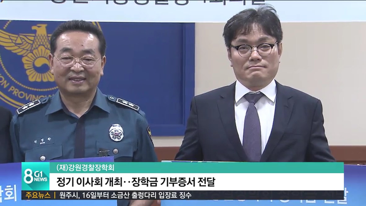 오늘 이사회에서는 조창진 강원경찰장학회 이사장 2천만원을 비롯해, 김용우 이사 등의 장학금 기부증서 전달식이 함께 열렸습니다.