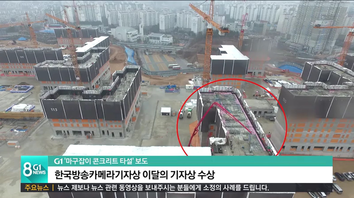 '마구잡이 콘크리트 타설' 보도는 비가 내리는데도 아파트 건설현장에서 구조물에 콘크리트를 타설하는 현장을 고발했고, 전문가와 정부기관 관계자들의 심층적 검증을 거치는 등 영상기자의 노력과 역량이 드러난 작품으로 평가 받았습니다.