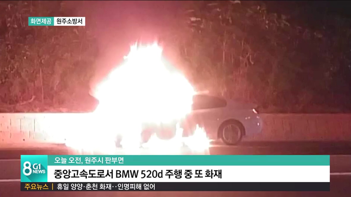 주행 중 화재사고가 잦아 리콜 결정이 내려진 BMW 520d 승용차에서 또 불이 났습니다.