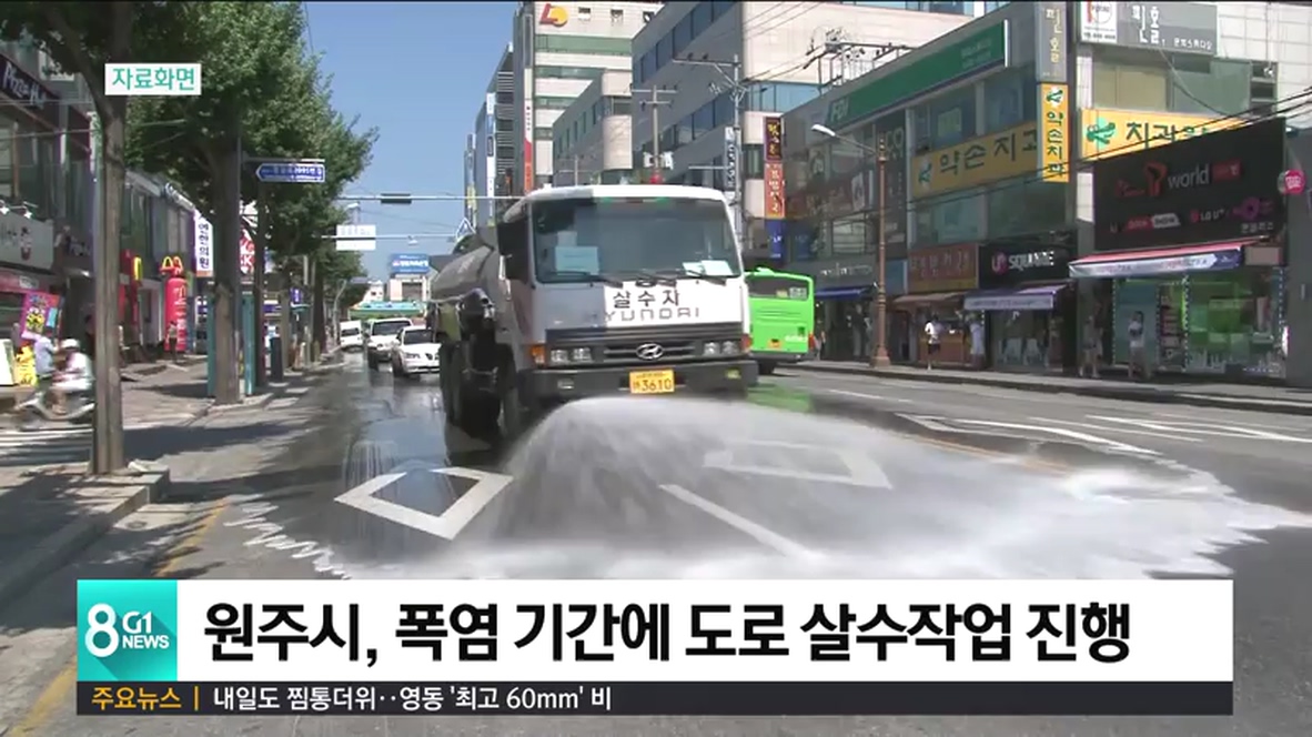 원주시는 내일(30일)부터 다음달 14일까지 16일동안 대형 살수차 4대를 동원해, 기온이 높은 시간대인 오전 10시반부터 오후 4시까지 살수작업을 진행한다고 밝혔습니다.