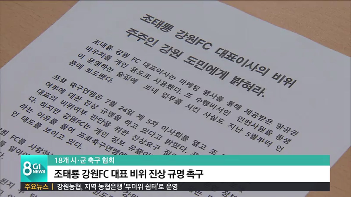 강원도 18개 시·군 축구협회는 오늘 강릉시청에서 기자회견을 열고 최근 불거진 조태룡 강원FC 대표의 비위 의혹에 대한 진상 조사를 촉구했습니다.